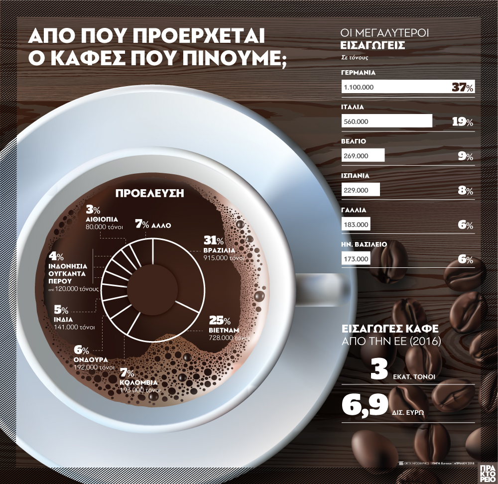 Το γράφημα αποτυπώνει στοιχεία της Eurostat για τις εισαγωγές καφέ στην ΕΕ, τις χώρες προέλευσης και τους μεγαλύτερους εισαγωγείς / ΑΠΕ-ΜΠΕ / Δημοσιογραφική επιμέλεια: Βασ. Κοριμέντζας