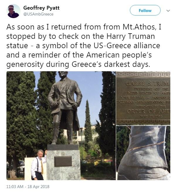"Μόλις επέστρεψα από τον Άθω, σταμάτησα να δω το άγαλμα του Χάρι Τρούμαν, ένα σύμβολο της συμμαχίας ΗΠΑ-Ελλάδας και μια υπενθύμιση της γενναιοδωρίας του αμερικανικού λαού κατά τη διάρκεια των πιο σκοτεινών χρόνων της Ελλάδας", έγραψε στο twitter.