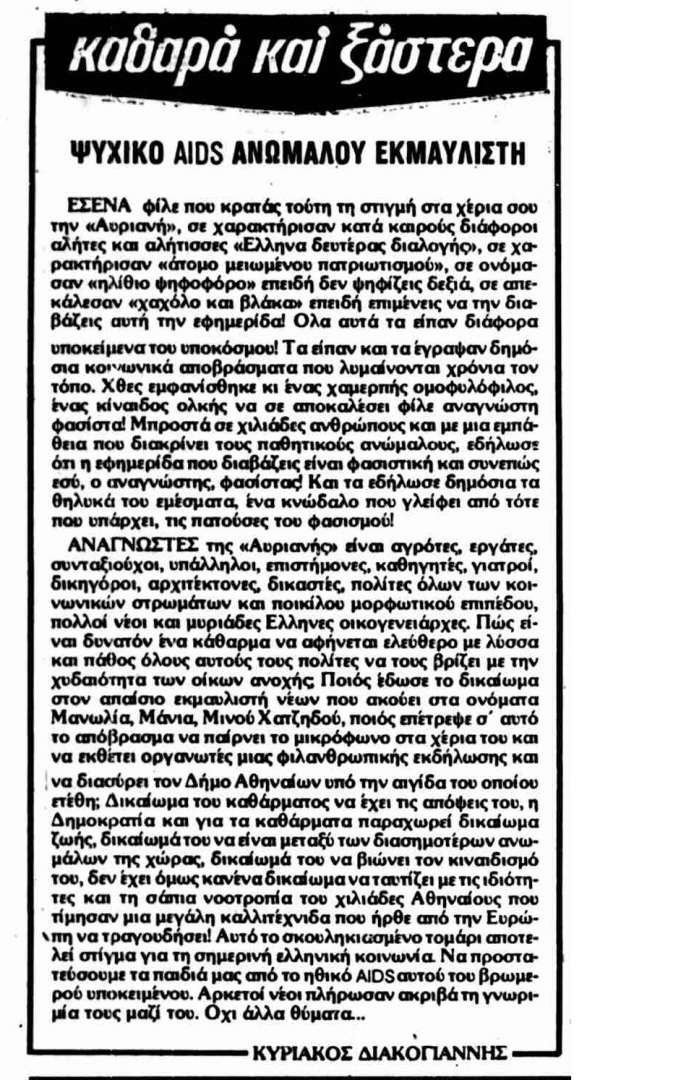 «Χθες εμφανίσθηκε ένας χαμερπής ομοφυλόφιλος, ένας κίναιδος ολκής, να σε αποκαλέσει φίλε αναγνώστη φασίστα! Μπροστά σε χιλιάδες ανθρώπους και με μια εμπάθεια που διακρίνει τους παθητικούς ανώμαλους, εδήλωσε ότι η εφημερίδα που διαβάζεις είναι φασιστική και συνεπώς εσύ, ο αναγνώστης, φασίστας! Πώς είναι δυνατόν ένα τέτοιο κάθαρμα να αφήνεται ελεύθερο με λύσσα και πάθος όλους αυτούς τους πολίτες να βρίζει με τη χυδαιότητα των οίκων ανοχής; Ποιος έδωσε το δικαίωμα στον απαίσιο εκμαυλιστή νέων, που ακούει στα ονόματα, Μάνια, Μανωλιά, Μίνου Χατζηδου, ποιος επέτρεψε σε αυτό το απόβρασμα να παίρνει το μικρόφωνο στα χέρια του και να εκθέτει οργανωτές μιας φιλανθρωπικής εκδήλωσης; Αυτό το σκουληκιασμενο τομάρι αποτελεί στίγμα για την σημερινή ελληνική κοινωνία. Να προστατεύσουμε τα παιδιά μας από το ηθικό ΑIDS αυτού του βρωμερού υποκείμενου.»