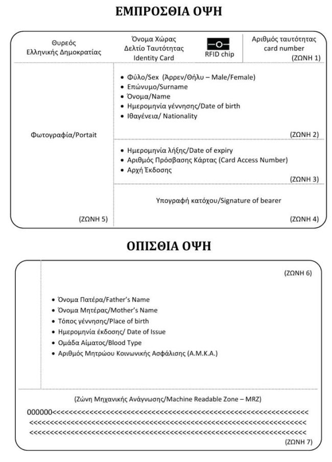 Οι νέες ταυτότητες θα έχουν συνολικά επτά «ζώνες» ασφαλείας, από τις οποίες οι πέντε θα βρίσκονται στην εμπρόσθια όψη τους και οι υπόλοιπες στην οπίσθια, ενώ ενσωματωμένο θα είναι και το ειδικό τσιπ που θα περιέχει σε ηλεκτρονική μορφή τη φωτογραφία και τα στοιχεία του κατόχου, το ύψος του, στοιχεία που απαιτούνται για Υπηρεσίες Ηλεκτρονικής Διακυβέρνησης, όπως ο δήμος εγγραφής, ο αριθμός δημοτολογίου και ο τόπος έκδοσης της ταυτότητας, αλλά και σε ψηφιακή μορφή το δακτυλικό του αποτύπωμα.