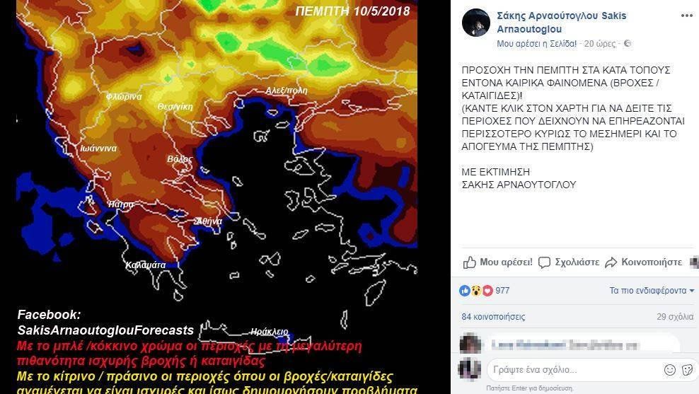 Για ισχυρά κατά τόπους φαινόμενα την Πέμπτη προειδοποιεί ο Σάκης Αρναούτογλου. Σύμφωνα με τα όσα έγραψε ο παρουσιαστής του καιρού της ΕΡΤ στην προσωπική του σελίδα στο Facebook αναμένονται έντονες βροχές και καταιγίδες.