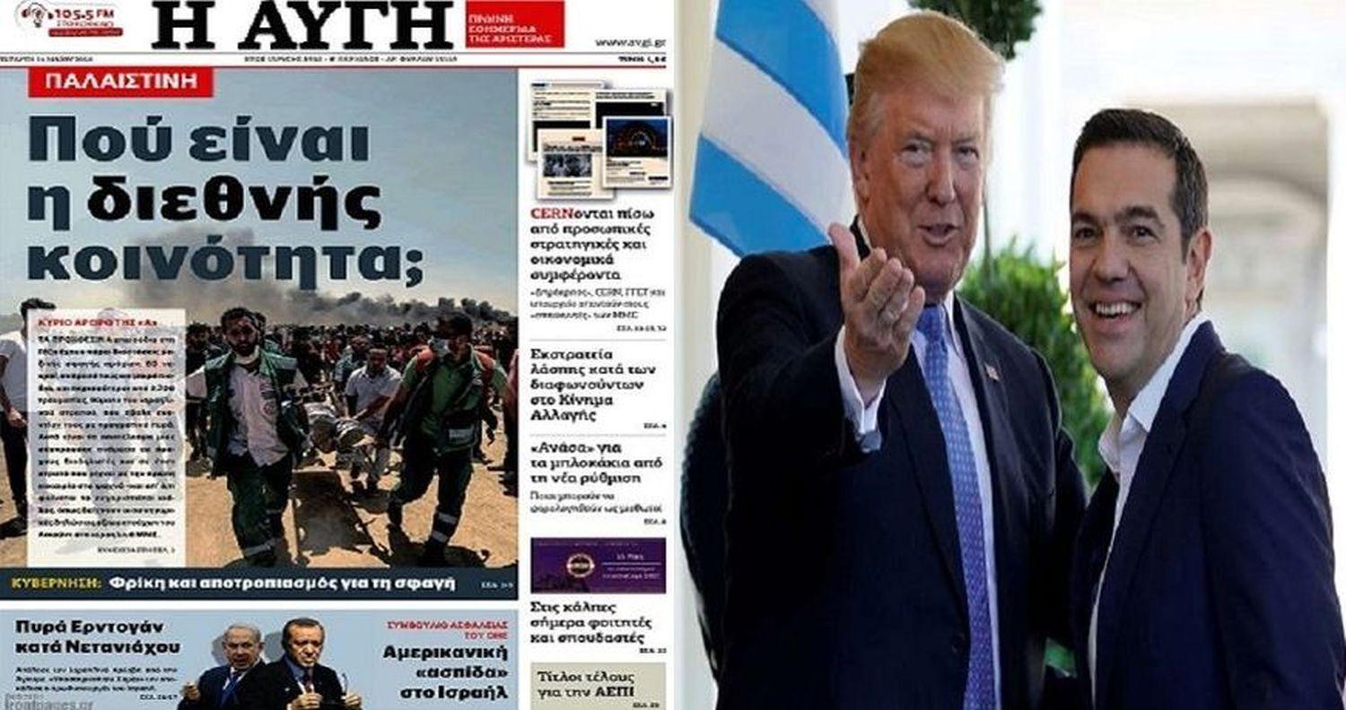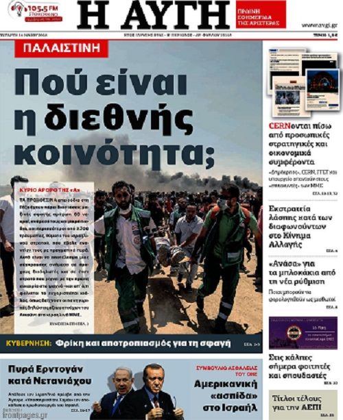 «Που είναι η διεθνής κοινότητα;», ρωτάει με ειλικρινή απορία η εφημερίδα «Αυγή» στο σημερινό της πρωτοσέλιδο (16/5/2018) με αφορμή το μακέλεμα του παλαιστινιακού λαού από το Ισραήλ και τις ΗΠΑ: