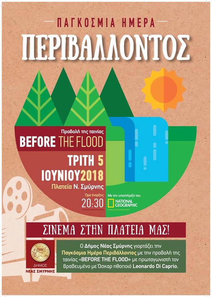 Οι εορτασμοί θα ολοκληρωθούν την Τρίτη 5 Ιουνίου στις 20:30 όπου η κεντρική πλατεία της Νέας Σμύρνης θα μεταμορφωθεί σε θερινό κινηματογράφο για να προβληθεί το ντοκιμαντέρ Before the flood, με πρωταγωνιστή τον βραβευμένο με Oscar ηθοποιό Leonardo DiCaprio. Το ντοκιμαντέρ- διατίθεται δωρεάν από το National Geographic που είχε αναλάβει και την παραγωγή του- και εστιάζει στις ραγδαίες κλιματικές αλλαγές που συμβαίνουν ως αποτέλεσμα του φαινόμενου του θερμοκηπίου, τις επιπτώσεις που έχουν αυτές στο οικοσύστημα και στους ανθρώπους, αλλά και τους τρόπους με τους οποίους μπορούμε να σώσουμε τον πλανήτη μας. Βασική επιδίωξη αποτελεί η αφύπνιση και ευαισθητοποίηση του θεατή γύρω από την προστασία του περιβάλλοντος.