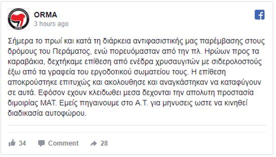 Επίθεση "με σιδερολοστούς" από μέλη της Χρυσής Αυγής καταγγέλλει η Οργάνωση Μαχητικού Αντιφασισμού.