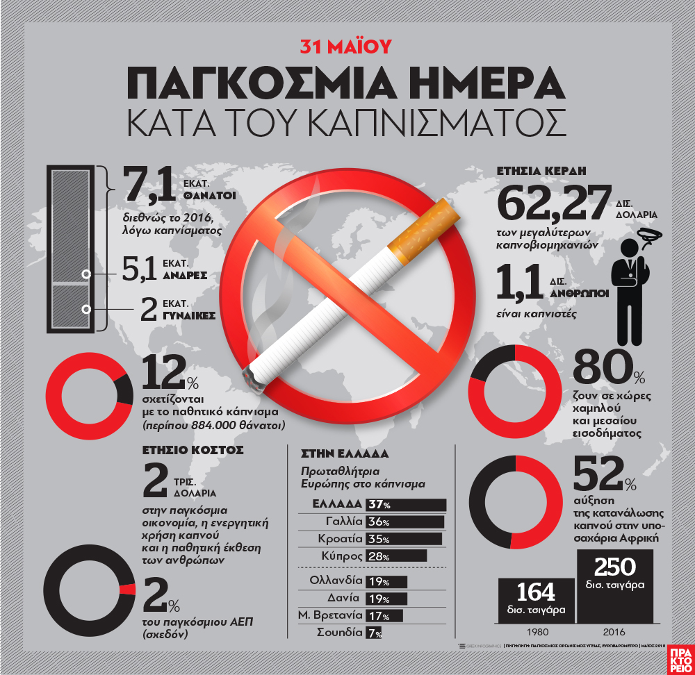 Ξεπέρασαν, με συντηρητικές μάλιστα εκτιμήσεις, τα 7,1 εκατομμύρια οι θάνατοι διεθνώς το 2016, λόγω του καπνίσματος (5,1 εκατ. άνδρες και 2 εκατ. γυναίκες). Από την άλλη, τα συνδυασμένα ετήσια κέρδη των μεγαλύτερων καπνοβιομηχανιών του κόσμου υπερέβησαν τα 62,27 δισεκατομμύρια δολάρια. Αυτό σημαίνει ότι στον θάνατο κάθε καπνιστή αντιστοιχούν κέρδη περίπου 9.730 δολαρίων, σύμφωνα με τον νέο -έκτο κατά σειρά- παγκόσμιο «Άτλαντα Καπνού», που δόθηκε στη δημοσιότητα στο πλαίσιο του 17ου Παγκόσμιου Συνεδρίου «Για τον Καπνό ή την Υγεία» στη Νότια Αφρική.