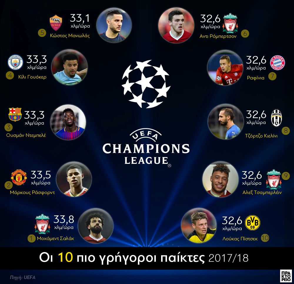 Πίσω από την Κώστα Μανωλά, την δεκάδα συμπληρώνουν πέντε παίκτες, που έχουν την ίδια ταχύτητα (32,6 χλμ/ωρ): Αντι Ρόμπερτσον (Λίβερπουλ), Ραφίνια (Μπάγερν), Τζόρτζο Κιελίνι (Γιουβέντους), Αλεξ Τσαμπερλέιν (Λίβερπουλ) και Λούκας Πίστσεκ (Ντόρτμουντ).