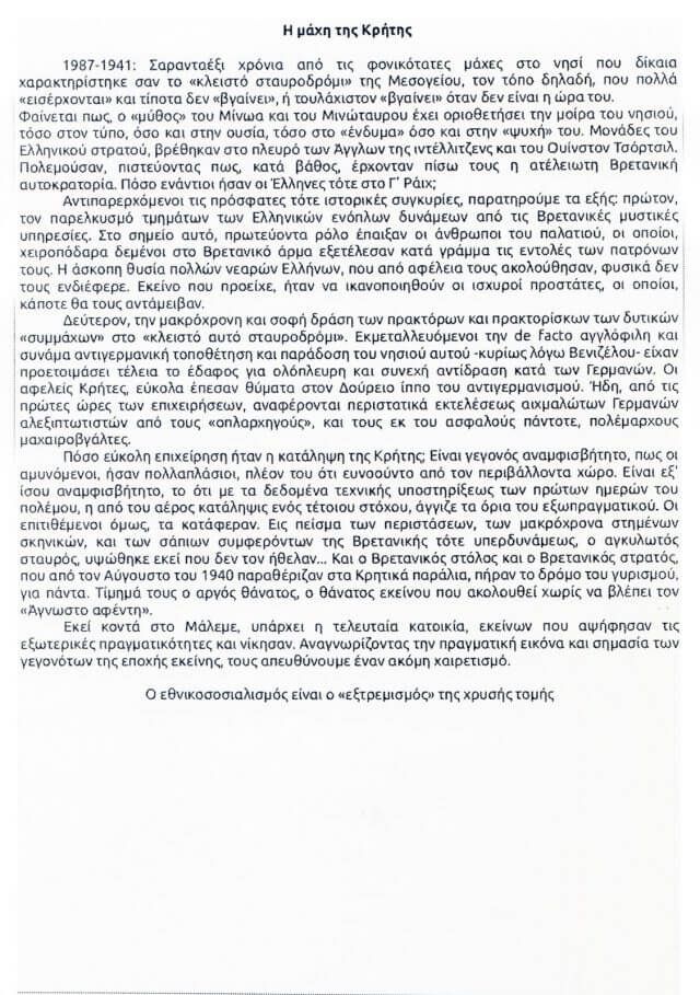 “Σαρανταέξι Χρόνια από τις φονικότατες μάχες στο νησί που δίκαια χαροκτηρίστηκε σαν το “κλειστό σταυροδρόμι” της Μεσογείου, τον τόπο δηλαδή, που πολλά “εισέρχονται” και τίποτα δεν “βγαίνει”, ή τουλάχιστον “βγαίνει” όταν δεν είναι η ώρα του. Φαίνεται πως ο “μύθος” του Μίνωα και του Μινώταυρου έχει οριοθετήσει την μοίρα του νησιού, τόσο στον τύπο, όσο και στην ουσία, τόσο στο “ένδυμα” όσο και στην “ψυχή” του. Μονάδες του Ελληνικού στρατού, βρέθηκαν στο πλευρό των Αγγλων της ιντέλλιτζενς και του Ουίνστον Τσόρτσιλ. Πολεμούσαν, πιστεύοντας πως, κατά βάθος, έρχονταν πίσω τους η ατέλειωτη Βρετανική αυτοκρατορία. Πόσο ενάντιοι ήσαν οι Ελληνες τότε στο Γ Ράιχ; Αντιπαρερχόμενοι τις πρόσφατες τότε ιστορικές συγκυρίες, παρατηρούμε τα εξής: Πρώτον, τον παρέλκυσμα τμημάτων των Ελληνικών ενόπλων δυνάμεων από τις Βρετανικές μυστικές υπηρεσίες. Στο σημείο αυτό, πρωτεύοντα ρόλο έπαιξαν οι άνθρωποι ταυ παλατιού, οι οποίοι, χειροπάδαρα δεμένοι στο Βρετανικό άρμα εξετέλεσαν κατά γράμμα τις εντολές των πατρόνων τους. Η άσκοπη θυσία πολλών νεαρών Ελλήνων, που από αφέλεια τους ακολούθησαν, φυσικά δεν τους ενδιέφερε. Εκείνο που προείχε, ήταν να ικανοποιηθούν οι ισχυροί προστάτες, οι οποίοι, κάποτε θα τους αντάμειβαν. Δεύτερον, την μακρόχρονη και σαφή δράση των πρακτόρων και πρακτορίσκων των δυτικών συμμάχων στο “κλειστό αυτό σταυροδρόμι”. Εκμεταλλευόμεναι την de φάκτο αγγλόφιλη και συνάμα αντιγερμανική τοποθέτηση και παράδοση του νησιού αυτού κυρίως λόγω Βενιζέλου, είχαν προετοιμάσει τέλεια τα έδαφος για ολόπλευρη και συνεχή αντίδραση κατά των Γερμανών. Οι αφελείς Κρήτες, εύκολα έπεσαν θύματα στον Δούρειο ίππο του αντιγερμανισμού. ‘Ηδη, από τις πρώτες ώρες των επιχειρήσεων, αναφέρονται περιστατικά εκτελέσεως αιχμαλώτων Γερμανών αλεξιπτωτιστών από τους “οπλαρχηγούς” και τους εκ του ασφαλούς πάντοτε, πολέμαρχους μαχαιροβγάλτες. Πόσο εύκολη επιχείρηση ήταν η κατάληψη της Κρήτης; Είναι γεγονός αναμφισβήτητο, πως οι αμυνόμενοι, ήσαν πολλαπλάσιοι, πλέον του ότι ευνοούνταν από τον περιβάλλοντα χώρο. Είναι εξ ίσου αναμφισβήτητο, το ότι με τα δεδομένα τεχνικής υποστηρίξεως των πρώτων ημερών του πολέμου, η από του αέρος κατάληψις ενός τέτοιου στόχου, άγγιζε τα όρια του εξωπραγματικού. Οι επιτιθέμενοι όμως, τα κατάφεραν. Εις πείσμα των περιστάσεων, των μακρόχρονα στημένων σκηνικών, και των σάπιων συμφερόντων της Βρετανικής τότε υπερδυνάμεως, ο αγκυλωτός σταυρός, υψώθηκε εκεί που δεν τον ήθελαν…
