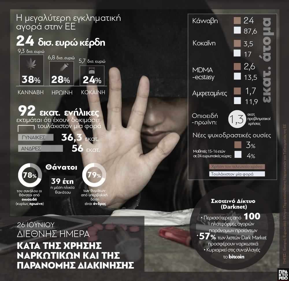 Όπως αναφέρεται σε έκθεση της Europol (Δεκέμβριος 2017), η αγορά ναρκωτικών παραμένει η μεγαλύτερη εγκληματική αγορά στην ΕΕ. Περισσότερο από το ένα τρίτο των εγκληματικών ομάδων που δραστηριοποιούνται στην ΕΕ εμπλέκονται στην παραγωγή ή διακίνηση διαφόρων τύπων ναρκωτικών. Από αυτά, το μεγαλύτερο μερίδιο αντιστοιχεί στην κάνναβη (38%), και ακολουθούν η ηρωίνη (28%) και η κοκαΐνη (24%). Τα τεράστια κέρδη που προκύπτουν από το εμπόριο ναρκωτικών χρηματοδοτούν διάφορες άλλες δραστηριότητες που επιτρέπουν στις εγκληματικές ομάδες να ευημερούν και να αναπτύσσονται σε βάρος της υγείας και της ασφάλειας των πολιτών της ΕΕ.