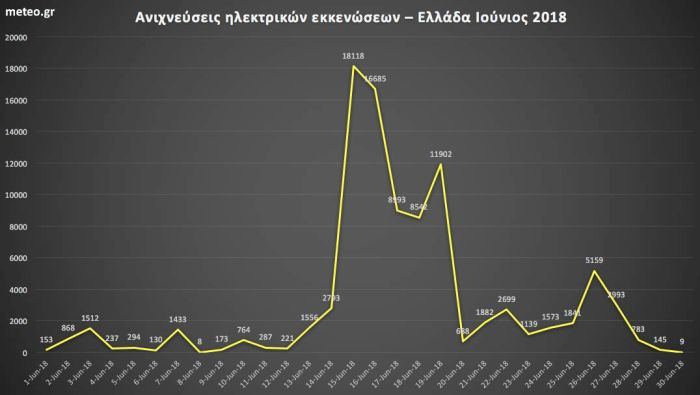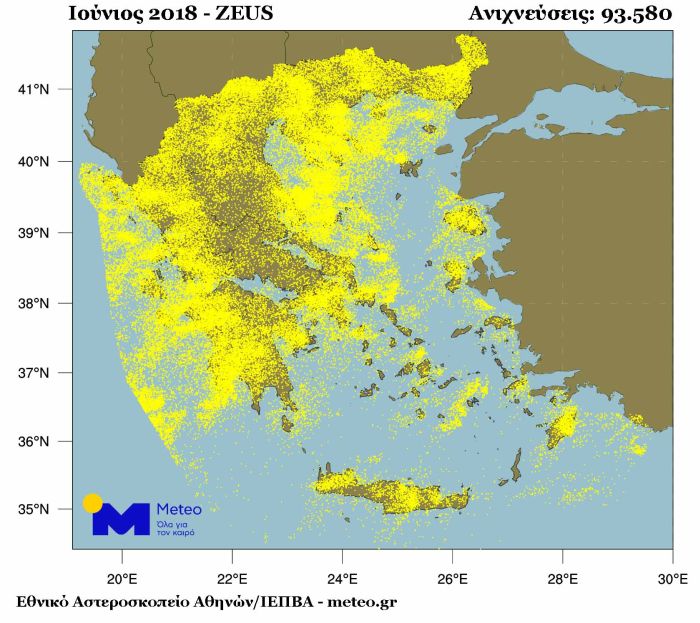 Ιδιαίτερα υψηλή δραστηριότητα ηλεκτρικών φαινομένων κατέγραψε το σύστημα ανίχνευσης ηλεκτρικών εκκενώσεων του Εθνικού Αστεροσκοπείου Αθηνών ZEUS κατά τη διάρκεια του Ιουνίου 2018.
