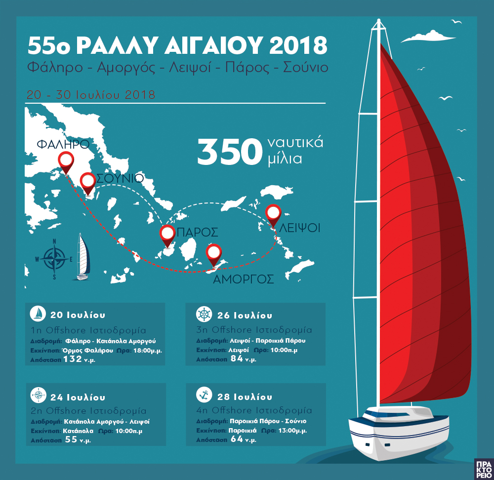 Ολα είναι έτοιμα για την έναρξη του 55ου Ράλι Αιγαίου που διοργανώνει ο Πανελλήνιος Όμιλος Ιστιοπλοΐας Ανοικτής θαλάσσης. Η εκκίνηση της μεγαλύτερης ιστιοπλοϊκής μονομαχίας του Αιγαίου θα δοθεί στις 20 Ιουλίου (18.00) από την πυραυλάκατο του Πολεμικού Ναυτικού «Μπλέσσας» και η πρώτη ιστιοδρομία είναι απόστασης 132 ν.μ., από το Φάληρο στην Αμοργό. Τα άλλα δύο νησιά – σταθμοί θα είναι οι Λειψοί και η Πάρος. Η εφετινή διοργάνωση είναι αφιερωμένη στην προστασία των θαλασσών και τα ιστιοπλοϊκά θα μεταφέρουν το μήνυμα «Να σώσουμε τις θάλασσές μας».