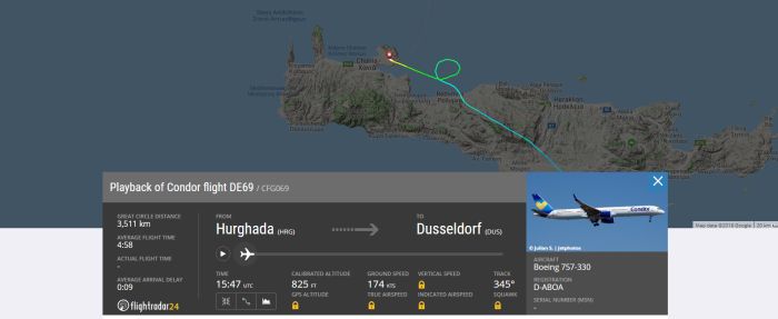 Το αεροσκάφος εκτελούσε το δρομολόγιο από Χουργκάντα (Αίγυπτος)-Ντίζελντορφ (Γερμανία), όταν έλαβε τηλεφώνημα για απειλή βόμβας, οπότε και προσγειώθηκε στο αεροδρόμιο των Χανίων.