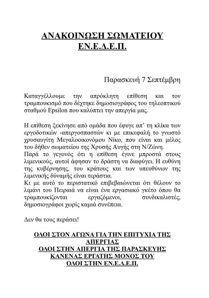 Όπως αναφέρεται σε ανακοίνωση του σωματείου, "η επίθεση ξεκίνησε από ομάδα που έφυγε απ' τη κλίκα των εργοδοτών - απεργοσπαστών και με επικεφαλής του γνωστό χρυσαυγίτη Μεγαλοοικονόμου Νίκο, που είναι και μέλος του δήθεν σωματείου της Χρυσής Αυγής στη Ν/Ζώνη".
