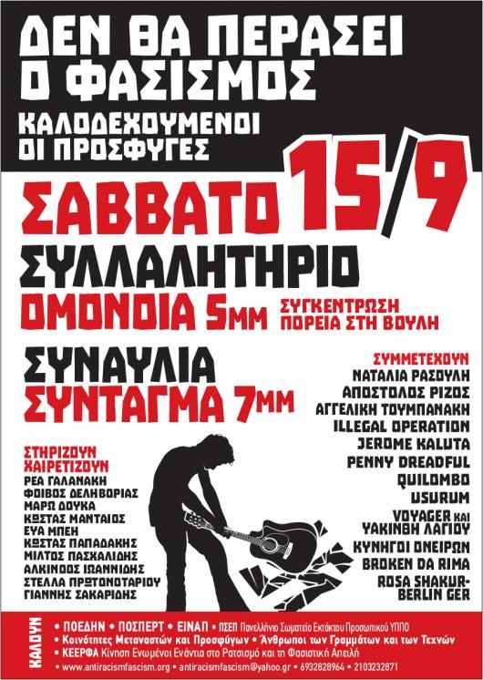 Από την πλευρά της, η ΚΕΕΡΦΑ, διοργανώνει αντιρατσιστική-αντιφασιστική συγκέντρωση στην Ομόνοια και στη συναυλία στο Σύνταγμα το Σάββατο 15 Σεπτέμβρη (διαβάστε αναλυτικά). Συμμετέχουν, μεταξύ άλλων: Ναταλία Ρασούλη, Απόστολος Ρίζος, Αγγελική Τουμπανάκη, Illegal Operation, Jerome Kaluta, Penny Dreadful, Quilombo, Usurum, Voyager και Υακίνθη Λάγιου, Κυνηγοί Ονείρων, Broken da Rima, Rosa Shakur-Berlin.