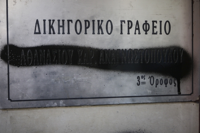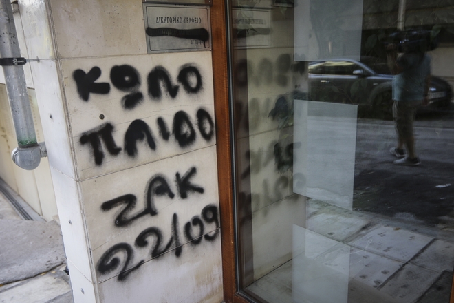 Συνθήματα κατά του δικηγόρου του κοσμηματοπώλη της Ομόνοιας που αντιμετωπίζει βαριές κατηγορίες για το θάνατο του Ζακ Κωστόπουλου έγραψαν άγνωστοι τα ξημερώματα στην είσοδο της πολυκατοικίας όπου στεγάζεται το γραφείο του.