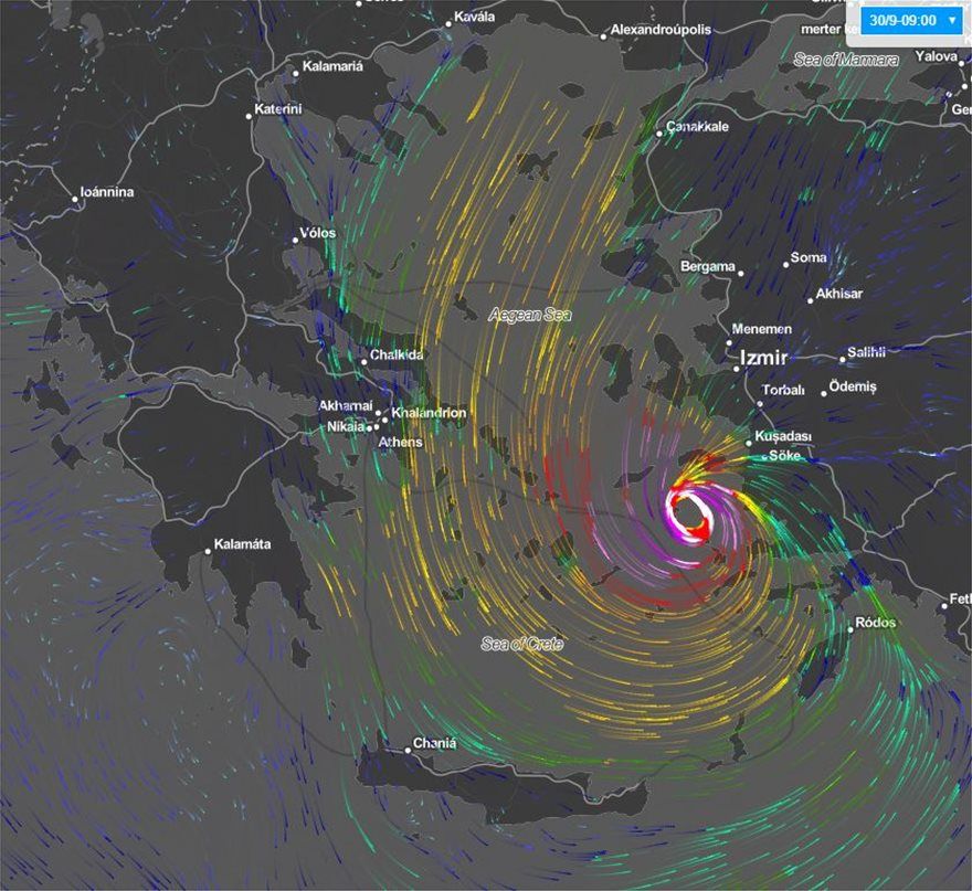 Συνεχίζεται η κακοκαιρία "Ξενοφών" με κύριο χαρακτηριστικό τους θυελλώδεις ανέμους (Εικόνα 1) και τις χαμηλές για την εποχή θερμοκρασίες την Πέμπτη 28/09. Βροχές και καταιγίδες αναμένονται το βράδυ της Πέμπτης και το πρωί της Παρασκευής 28/09 κυρίως στην Ανατολική Στερεά, στην Πελοπόννησο, στις Κυκλάδες και στην Κρήτη.