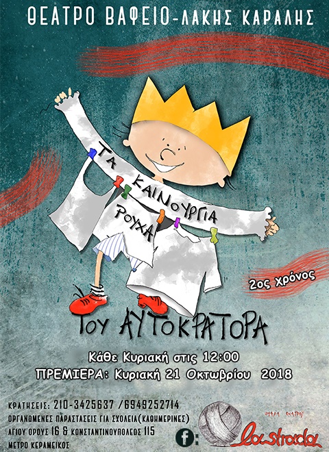 Το διαχρονικό παραμύθι του Χανς Κρίστιαν Άντερσεν «Τα Καινούρια Ρούχα του Αυτοκράτορα» επιστρέφει για δεύτερη συνεχόμενη χρονιά στο θέατρο Βαφείο-Λάκης Καραλής από 21 Οκτωβρίου 2018 κάθε Κυριακή στις 12:00 και για καθημερινές ομαδικές παραστάσεις.