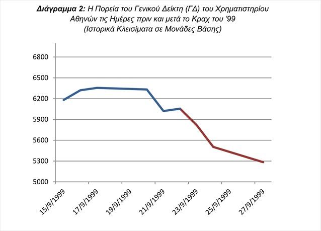 Αξίζει να παραθέσουμε και τον δείκτη τιμών από το περήφημο χρηματιστηριακό κραχ του 1999. Όπως μπορείτε να δείτε, η υποχώρηση του δείκτη μετά βίας υποχώρισε κατά 1.000 μονάδες (πηγή γραφήματος: Ναυτεμπορική).
