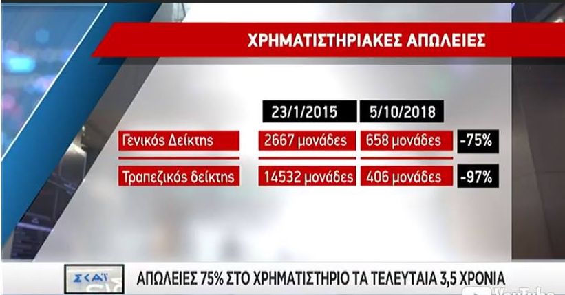 Εξόφθαλμη είναι η προσπάθεια παρουσίασης ψευδών στοιχείων με στόχο τη χειραγώγηση της κοινής γνώμης από τον όμιλο του ΣΚΑΪ που ούτε λίγο ούτε πολύ παρουσίασε ως «είδηση» ότι οι χρηματιστηριακές απώλειες μειώθηκαν κατά 75% μέσα σε 3 μόλις χρόνια. Μάλιστα ο τραπεζικός δείκτης σχεδόν μειώθηκε στο μισό, όπως δείχνει χαρακτηριστικά η καρτέλα: