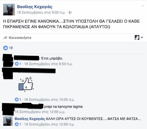 Στιγμιότυπο από την επίθεση σε γυναίκες από το το «αγανακτισμένο» πλήθος. Ο Βασίλης Κεχαγιάς, στα αριστερά, φορώντας μπλε αμάνικο μπλουζάκι και γυαλιά στο κεφάλι. Φωτογραφία από το emprosnet.gr. Αντίστοιχο στιγμιότυπο και από ρεπορτάζ του Αθηναϊκού Πρακτορείου, εδώ.Φωτογραφία του Βασίλη Κεχαγιά από το δημόσιο προφίλ του στο facebook