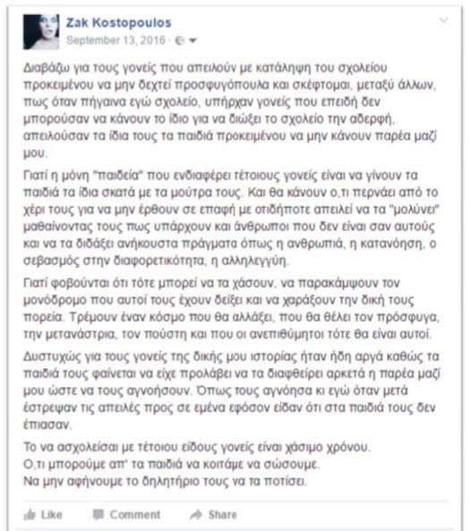 Ο Ζ.Κ (ή Zackie Oh!) διατηρούσε λογαριασμό και στα social media, απ΄όπου σχολίαζε διάφορα θέματα επικαιρότητας. Εντοπίσαμε μια επίκαιρη ανάρτηση, για την εκπαίδευση των προσφυγόπουλων, σε μια ανάρτηση του 2016 που σχολίαζε τα γεγονότα στο Ωραιόκαστρο: