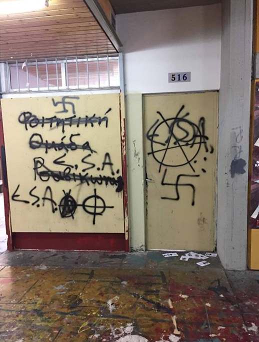 Νεοναζί εισέβαλαν στον χώρο της Φιλοσοφικής Αθηνών, έγραψαν συνθήματα και σχεδίασαν αγκυλωτούς σταυρούς έξω και γύρω από την αίθουσα που δημιούργησε στέκι η Φοιτητική Ομάδα του Ρουβίκωνα.