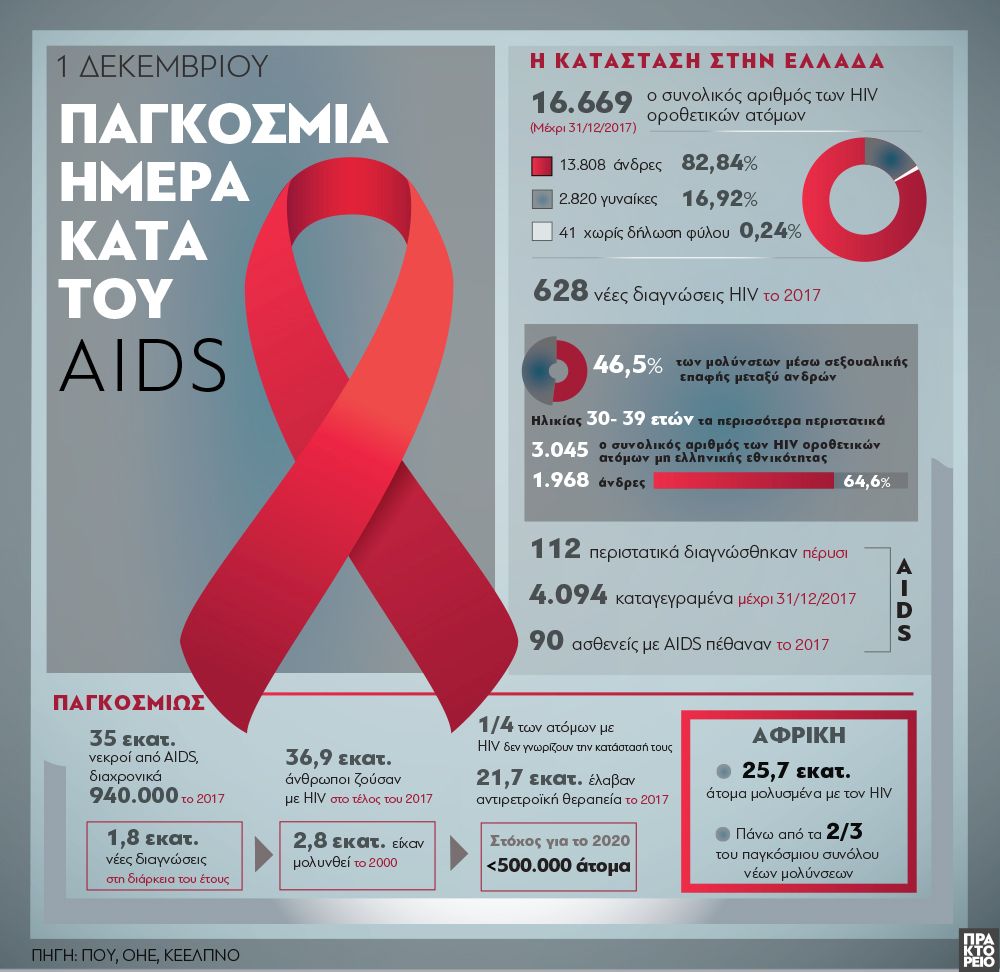 Συνολικά, οι περιπτώσεις AIDS που έχουν δηλωθεί στην Ελλάδα μέχρι την 31η Δεκεμβρίου του 2017, ανέρχονται σε 4.094, εκ των οποίων 3.423 (83,6%) ήταν άνδρες και 671 (16,4%) γυναίκες.