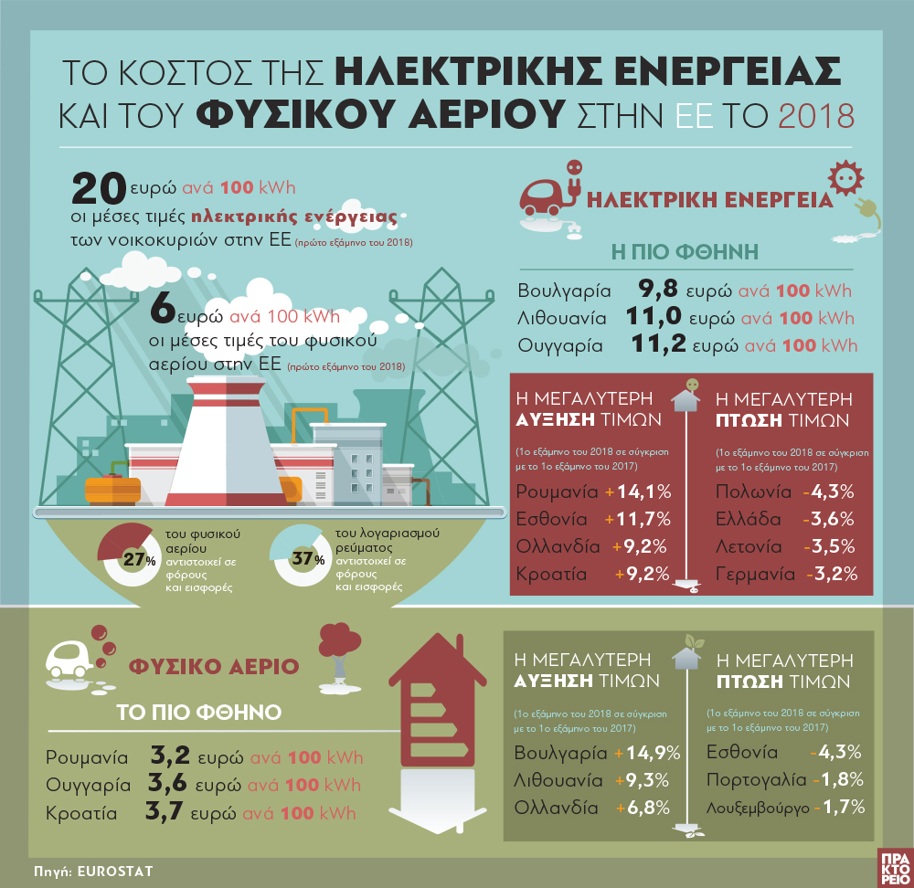 Οι μέσες τιμές ηλεκτρικής ενέργειας των νοικοκυριών το πρώτο εξάμηνο του 2018 ήταν εκφρασμένες σε ευρώ χαμηλότερες στη Βουλγαρία (9,8 ευρώ ανά 100 kWh), στη Λιθουανία (11,0) και στην Ουγγαρία (11,2 ευρώ) και υψηλότερες στη Δανία (31,3 ευρώ) και το Βέλγιο (27,3 ευρώ).