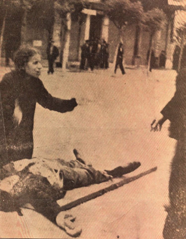 Οι σύντροφοί του ξηλώνουν μια πόρτα και τοποθετούν πάνω της τη σορό του νεκρού. Η μάνα του Τάσου Τούση, που ήταν στη διαδήλωση, για να προφυλάξει την, επίσης, απεργό κόρη της, βλέπει το νεκρό γιο της, τρέχει, γονατίζει και οδύρεται πάνω από τη σορό του. Κάποιος περνά και φωτογραφίζει τη συνταρακτική εικόνα.
