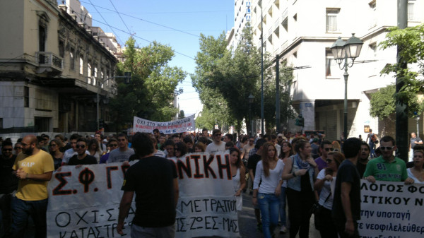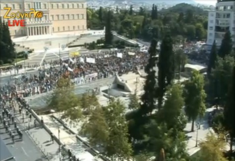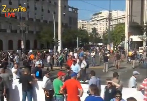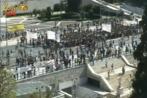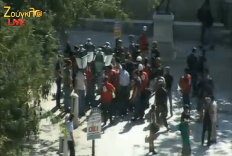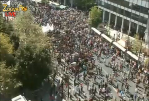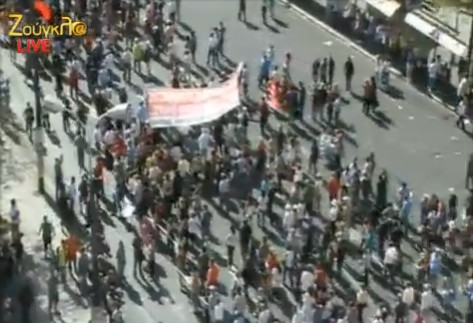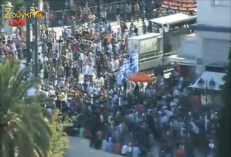 1.40 Οι πρώτοι διαδηλωτές διέρχονται την Οθωνος και πηγαίνουν προς την Αμαλίας. Πλήθος διαδηλωτών υπάρχουν στην Σταδίου