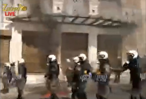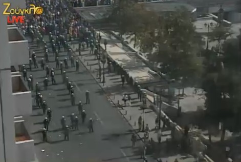 Τα ΜΑΤ έχουν παραταχθεί απαγορεύοντας την άνοδο προς τη Βουλή. Τα μπλοκ των διαδηλωτών περνάνε κάτω από το Σύνταγμα.