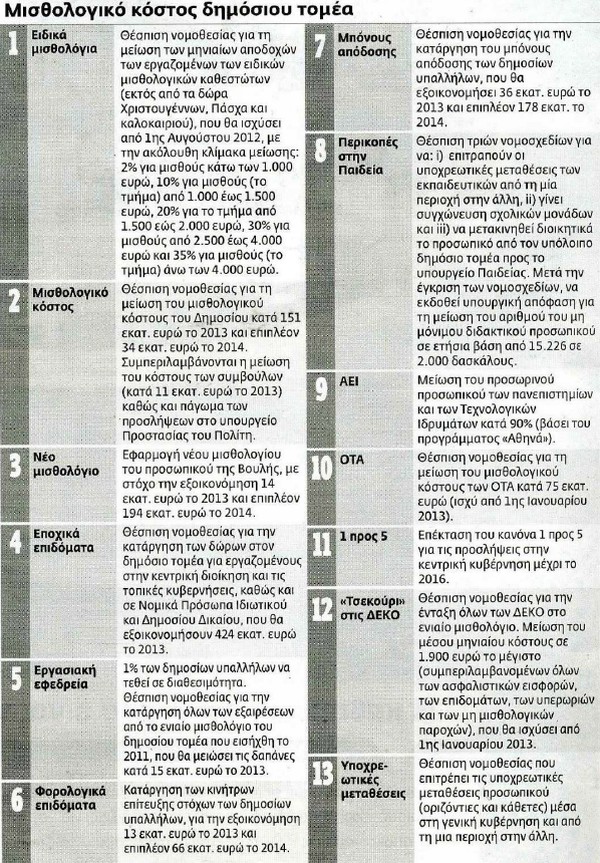 - Μεγάλες περικοπές στις ΔΕΚΟ όπου «κουρεύονται» εκ νέου όλοι οι μισθοί ώστε οι μεικτές αποδοχές των εργαζομένων να μην ξεπερνούν τα 1.900 ευρώ τον μήνα.