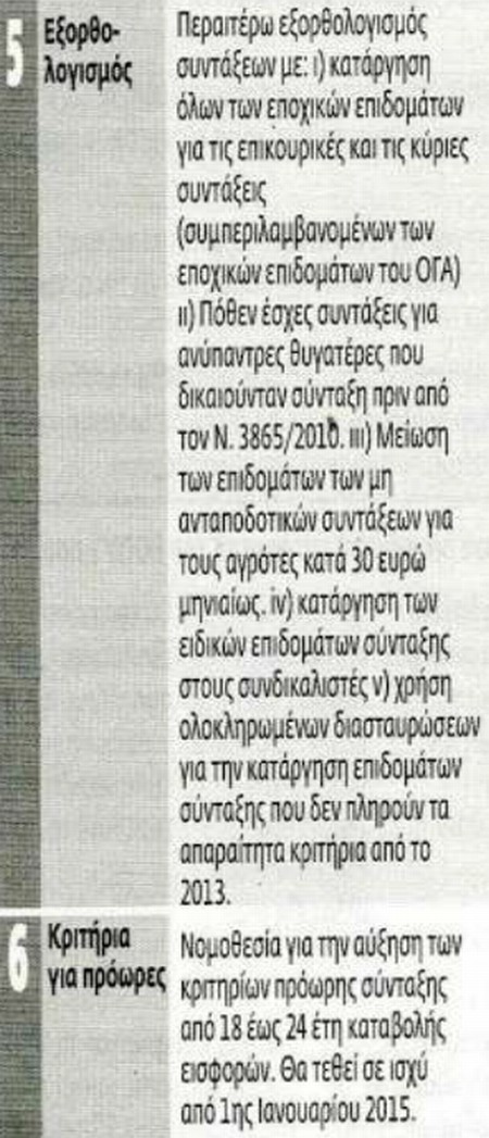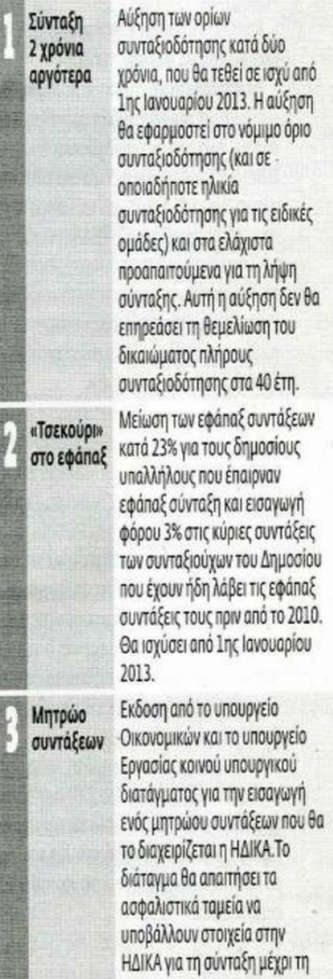 Το μέτρο που θα ανατρέψει τη ζωή χιλιάδων εργαζομένων και θα κάνει πιο αβέβαιο το μέλλον των ανέργων μεγάλης ηλικίας είναι η αύξηση του ορίου ηλικίας συνταξιοδότησης κατά δύο χρόνια. Σύμφωνα με τα κείμενα το μέτρο θα έχει γενική εφαρμογή, χωρίς εξαιρέσεις, ακόμη και για όσους έχουν θεμελιώσει δικαίωμα. Δείτε στον παρακάτω πίνακα τι υπόγραψει η τρικομματική κυβέρνηση