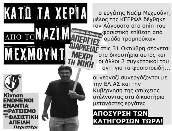 Τρεις μετανάστες δικάζονται την Τετάρτη 31/10 στην Ευελπίδων. Πρόκειται για τους Ναζίμ Μαχμούτ, Μοντασέρ Αλί και Μουχτάρ Αχμέτ. Συνελήφθησαν στην διάρκεια φασιστικής επίθεσης με τη συνενοχή της Ελληνικής Αστυνομίας που οργανώθηκε τα ξημερώματα της Κυριακής 29 Ιούλη σε σπίτια Πακιστανών μεταναστών στο Περιστέρι. Οι θύτες παριστάνοντας τα θύματα, κατέθεσαν μηνύσεις σε βάρος των Πακιστανών που δέχθηκαν επίθεση μέσα στο σπίτι τους!