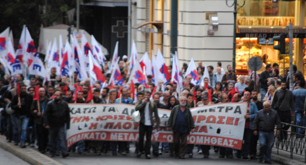 17.20 Στην κεφαλή της πορείας του ΠΑΜΕ βρίσκεται το Συνδικάτο Μετάλλου. Το πανό τους γράφει: Κάτω τα αντιλαϊκά μέτρα, την κρίση να πληρώσει η πλουτοκρατία"
