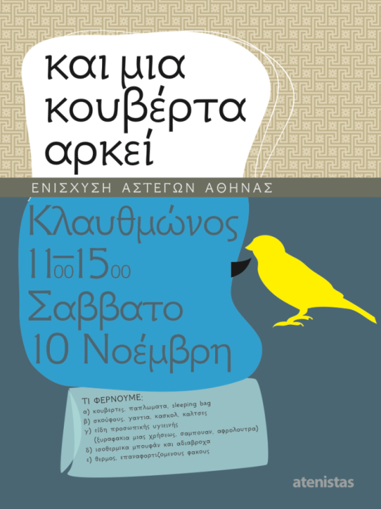 Σε μία προσπάθεια να μπορέσουν οι άστεγοι της Αθήνας να αντιμετωπίσουν το χειμώνα που έρχεται και να έχουν κουβέρτες και ρούχα οι Atenistas καλούν σήμερα Σάββατο στην Πλατεία Κλαυθμώνος όποιον μπορεί να έρθει να συνδράμει το έργο τους. Συγκεκριμένα από τις 11 το πρωί έως τις 3 το απόγευμα θα δέχονται κουβέρτες και ρούχα για τους άπορους και τους άστεγους.
