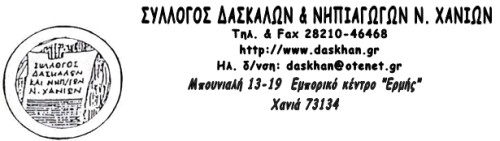 Το Δ.Σ του Συλλόγου Δασκάλων και Νηπιαγωγών Ν. Χανίων καταδικάζει με τον πιο κατηγορηματικό τρόπο τις τρομοκρατικές συλλήψεις στις οποίες προχώρησε η ασφάλεια Θεσσαλονίκης συλλαμβάνοντας στο χώρο εργασίας τους, τον εκπαιδευτικό Αγαπητό Θανάση, μέλος Δ.Σ. Β΄ Συλλόγου Εκπ/κών Π.Ε. Θεσ/νίκης, μέλος Ε.Ε. Ν/Τ ΑΔΕΔΥ-ΕΔΟΘ και πρώην μέλος του Δ.Σ. της ΔΟΕ και τους εργαζόμενους στους δήμους Ευόσμου και Κορδελιού, Αρβανίτη Σαράντη και Κυρατζόπουλο Θωμά, απαγγέλλοντάς τους κατηγορίες για διατάραξη κοινής ειρήνης και παράνομη βία και τους πηγαίνει για τακτική δικάσιμο.
