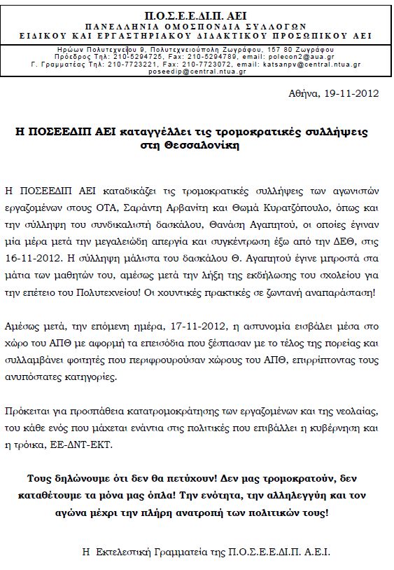 Σήμερα, και ενώ κορυφώνονται οι εκδηλώσεις για τον εορτασμό της εξέγερσης του Πολυτεχνείου, η κυβέρνηση δείχνει το επαίσχυντο πρόσωπο του σύγχρονου κοινοβουλευτικού ολοκληρωτισμού, της νέας χούντας. Κάνοντας χρήση του βίντεο από την κινητοποίηση των εργαζομένων σε συνέδριο στο χώρο της ΔΕΘ, όπου βρισκόταν και ο Γερμανός πρόξενος, η ασφάλεια Θεσσαλονίκης προχώρησε σε συλλήψεις εκφοβισμού και τρομοκράτησης. Συνέλαβε στο χώρο εργασίας τους τον σύντροφο και συναγωνιστή δάσκαλο Αγαπητό Θανάση, μέλος Δ.Σ. του Β΄ Συλλόγου Εκπ/κών Π.Ε. Θεσ/νίκης, Μέλος της Ε.Ε. Ν/Τ ΑΔΕΔΥ-ΕΔΟΘ και πρώην μέλος του Δ.Σ. της ΔΟΕ και τους εργαζόμενους στους δήμους Ευόσμου και Κορδελιού, Αρβανίτη Σαράντη και Κυρατζόπουλο Θωμά. Μετά τη σύλληψή τους απαγγέλθηκαν εναντίον τους κατηγορίες για διατάραξη κοινής ειρήνης και παράνομη βία και οδηγούνται σε τακτική δικάσιμο.