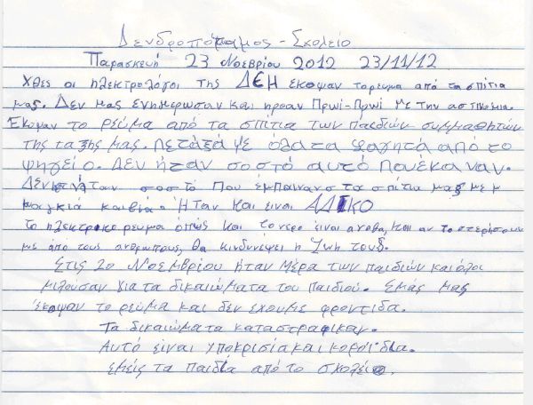 Ανάμεσα στις οικογένειες που έχουν υποστεί τη βίαιη διακοπή της παροχής είναι και οικογένειες μαθητών της τάξης μας και μάλιστα πολύτεκνες οικογένειες με 5, 6 και 7 παιδιά. Το ομαδικό και πρωτόλειο κείμενο γραμματισμού των παιδιών της τάξη, που συνοδεύει την επιστολή, περιγράφει με ενάργεια τη μεθοδικότητα της παρέμβασης της ΔΕΗ. Από μόνο του είναι ντοκουμέντο για ευαισθητοποίηση και οργάνωση παρεμβάσεων όλων των Θεσμών που ασχολούνται με τα Δικαιώματα του πολίτη και τις παραβιάσεις τους: Δήμο, Δικαιοσύνη, άλλες ανεξάρτητες αρχές και φυσικά το Συνήγορο του Παιδιού.