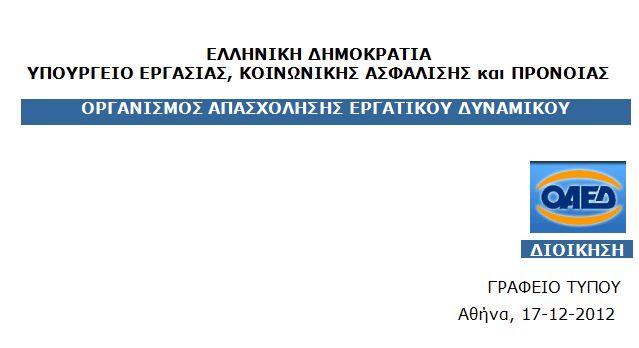 Ακολουθεί το αναλυτικό στατιστικό δελτίο του ΟΑΕΔ για την κίνηση της αγοράς εργασίας το μήνα Νοέμβριο του 2012.
