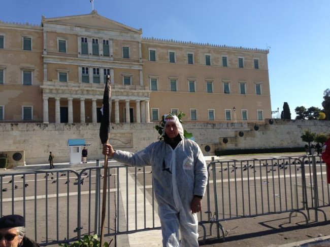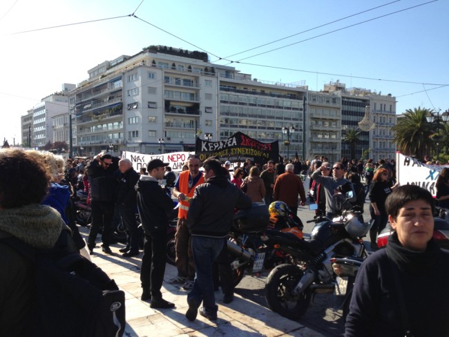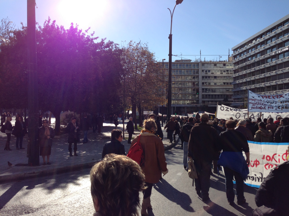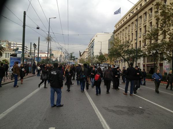 Η πορεία περνάει από το άγαλμα του Κολοκοτρώνη, διμοιρίες ΜΑΤ είναι χαλαρές στα γύρω στενά.
