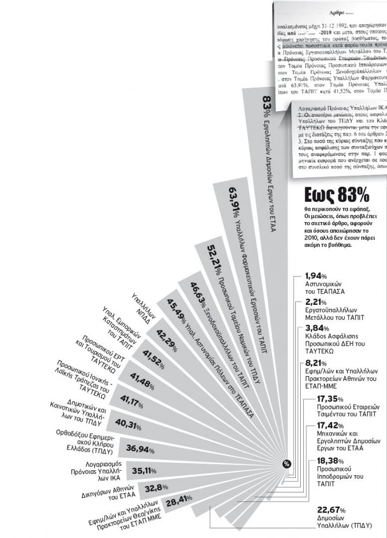 Οι μειώσεις για τους ασφαλισμένους του Ταμείου Πρόνοιας Δημοσίων Υπαλλήλων και τον Κλάδο Ασφάλισης Προσωπικού ΔΕΗ (του ΤΑΥΤΕΚΩ) θα εφαρμοστούν παράλληλα με την περικοπή που είχε γίνει τον Νοέμβριο. Δηλαδή οι συγκεκριμένοι ασφαλισμένοι θα δουν μέσα σε έναν χρόνο το εφάπαξ τους να μειώνεται δύο φορές.