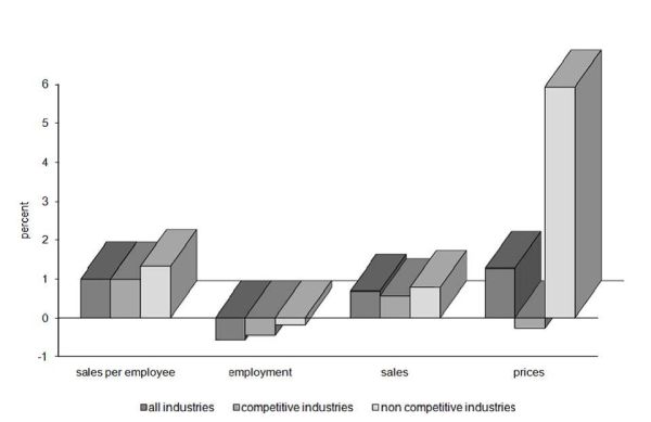 Τα αποτελέσματα όπως φαίνεται στην προηγούμενη εικόνα, ταξινομούνται α) για το σύνολο των επιχειρήσεων (σκούρο γκρι), β) για την υπο-ομάδα των ανταγωνιστικών (πιο ανοιχτό γκρι) και γ) για την υπο-ομάδα των μη-ανταγωνιστικών (σχεδόν λευκό).
