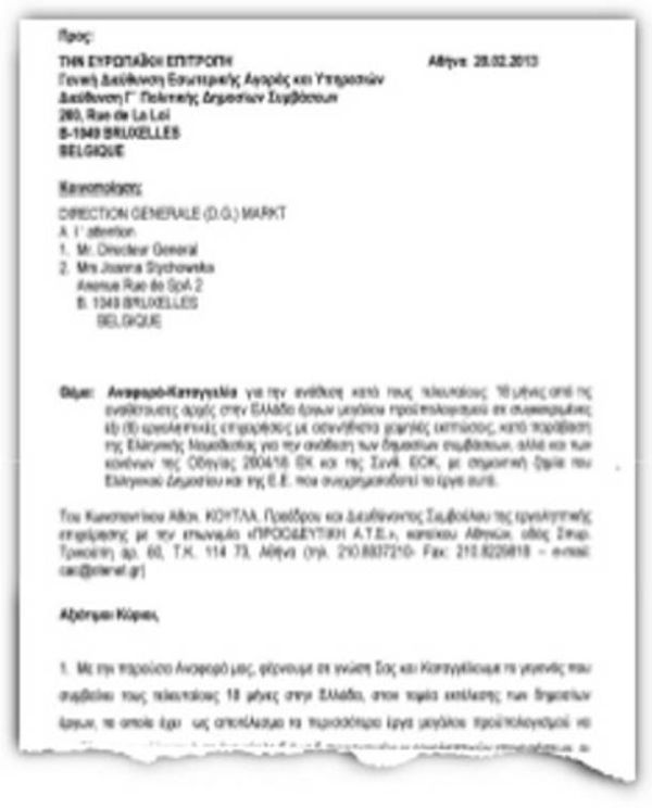 Η «Κ.Ε.» φέρνει στο φως το έγγραφο-ντοκουμέντο της «καταγγελίας-αναφοράς», που κατατέθηκε από τον Κωνσταντίνο Αθ. Κούτλα, πρόεδρο και διευθύνοντα σύμβουλο της εργοληπτικής επιχείρησης Προοδευτική ΑΤΕ στη Γενική Διεύθυνση Εσωτερικής Αγοράς και Υπηρεσιών της Ευρωπαϊκής Επιτροπής, με ημερομηνία 20 Φεβρουαρίου 2013. Η ίδια καταγγελία βρίσκεται στα χέρια του οικονομικού εισαγγελέα Γρ. Πεπόνη, ο οποίος έχει ζητήσει την άσκηση έρευνας, ενώ έχει κοινοποιηθεί στο Ελεγκτικό Συνέδριο και στο γενικό επιθεωρητή Δημόσιας Διοίκησης, Λ. Ρακιντζή. Ο Κ. Κούτλας είναι γνωστός εργολήπτης, με οικογενειακή παράδοση στο χώρο των κατασκευών. Οι δραστηριότητές του αντιμετωπίζουν εδώ και αρκετό καιρό οικονομικά προβλήματα και ο ίδιος έχει καταγγείλει και στο παρελθόν μεθοδεύσεις από συναδέλφους του. Είναι η πρώτη φορά που εμφανίζεται στην Ευρωπαϊκή Επιτροπή.