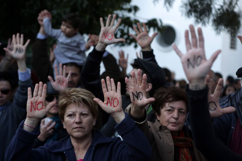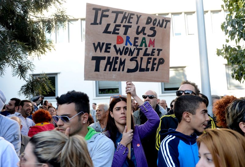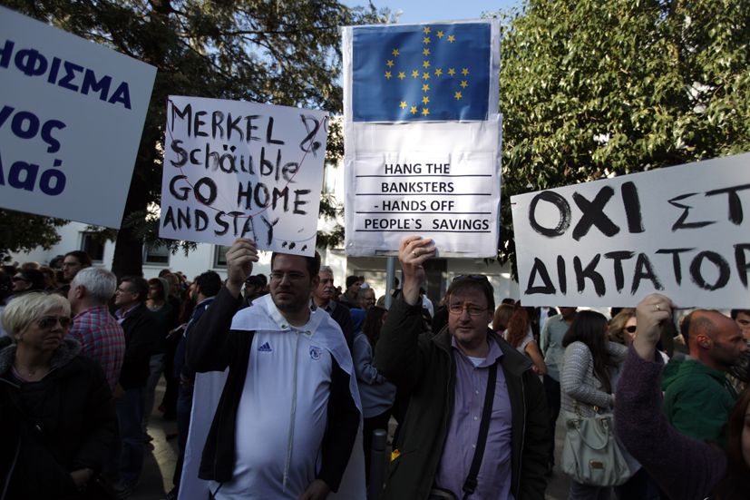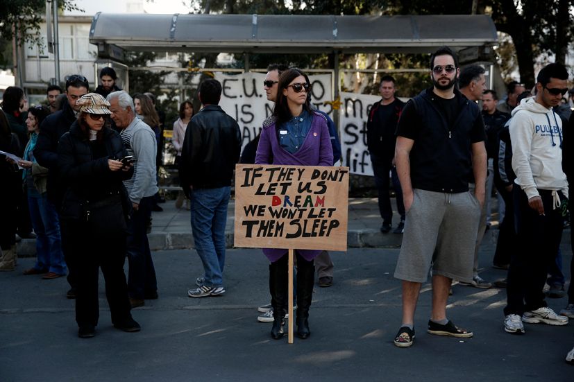 Έξω από την είσοδο της Βουλής, οι διαδηλωτές άφησαν απορρίμματα και μαλλί προβάτων στέλνοντας ενώ άλλοι επέλεξαν να γράψουν συνθήματα στις παλάμες τους και σε πανό φωνάζοντας με ντουντούκες, διαμαρτυρόμενοι κατά του νομοσχεδίου για κούρεμα καταθέσεων.