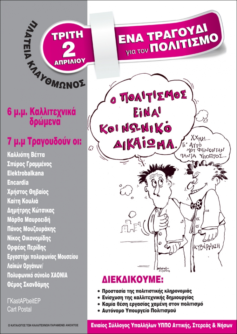 Ο Ενιαίος Σύλλογος Υπαλλήλων ΥΠΠΟ συνεχίζοντας τις κινητοποιήσεις ενάντια στα κυβερνητικά σχέδια συρρίκνωσης και διάλυσης των υπηρεσιών πολιτισμού διοργανώνει την Τρίτη 2 Απρίλη, στις 6 μ.μ. στην Πλατεία Κλαυθμώνος καλλιτεχνική εκδήλωση διαμαρτυρίας για την ενημέρωση των πολιτών και την προβολή των κεντρικών αιτημάτων: