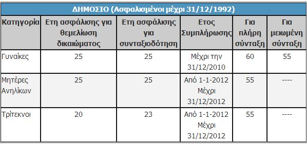 - Γυναίκες. Σε περίπτωση που συμπλήρωσαν 25 έτη ασφάλισης σε δημόσιο και ιδιωτικό τομέα μέχρι 31 Δεκεμβρίου 2010 θεμελιώνουν δικαίωμα για τα 55 με μειωμένη σύνταξη.