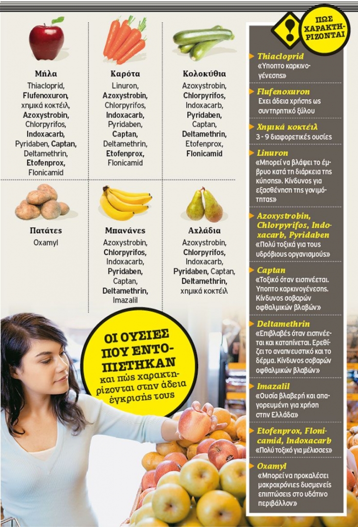 Διατροφικό σκάνδαλο στην Ελλάδα καταγγέλλει η περιβαλλοντική οργάνωση Greenpeace. Επικίνδυνα φυτοφάρμακα -ορισμένα εκ των οποίων έχουν απαγορευτεί καθώς ενοχοποιούνται για καρκινογενέσεις και βλαπτική επίδραση στα έμβρυα- εντοπίστηκαν σε μήλα, μπανάνες, αχλάδια, πατάτες, καρότα, κρεμμύδια και κολοκύθια που πωλούνται στη χώρα μας.