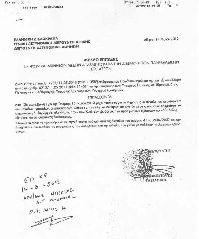 Το φύλλο επίταξης «κινητών και ακίνητων μέσων απαραίτητων για τη διεξαγωγή των πανελλαδικών εξετάσεων» από την ΕΛ.ΑΣ