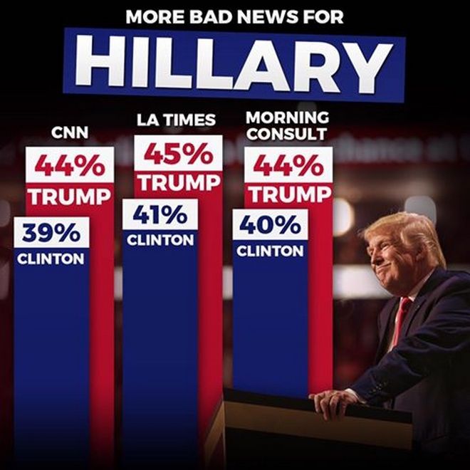 Ανατροπή σκηνικού στην κούρσα για τις προεδρικές εκλογές του Νοεμβρίου στις ΗΠΑ, με τον Ντόναλντ Τραμπ, υποψήφιο του Ρεπουμπλικανικού Κόμματος ξεπέρασε την Χίλαρι Κλίντον των Δημοκρατικών σε δύο Δημοσκοπήσεις.
