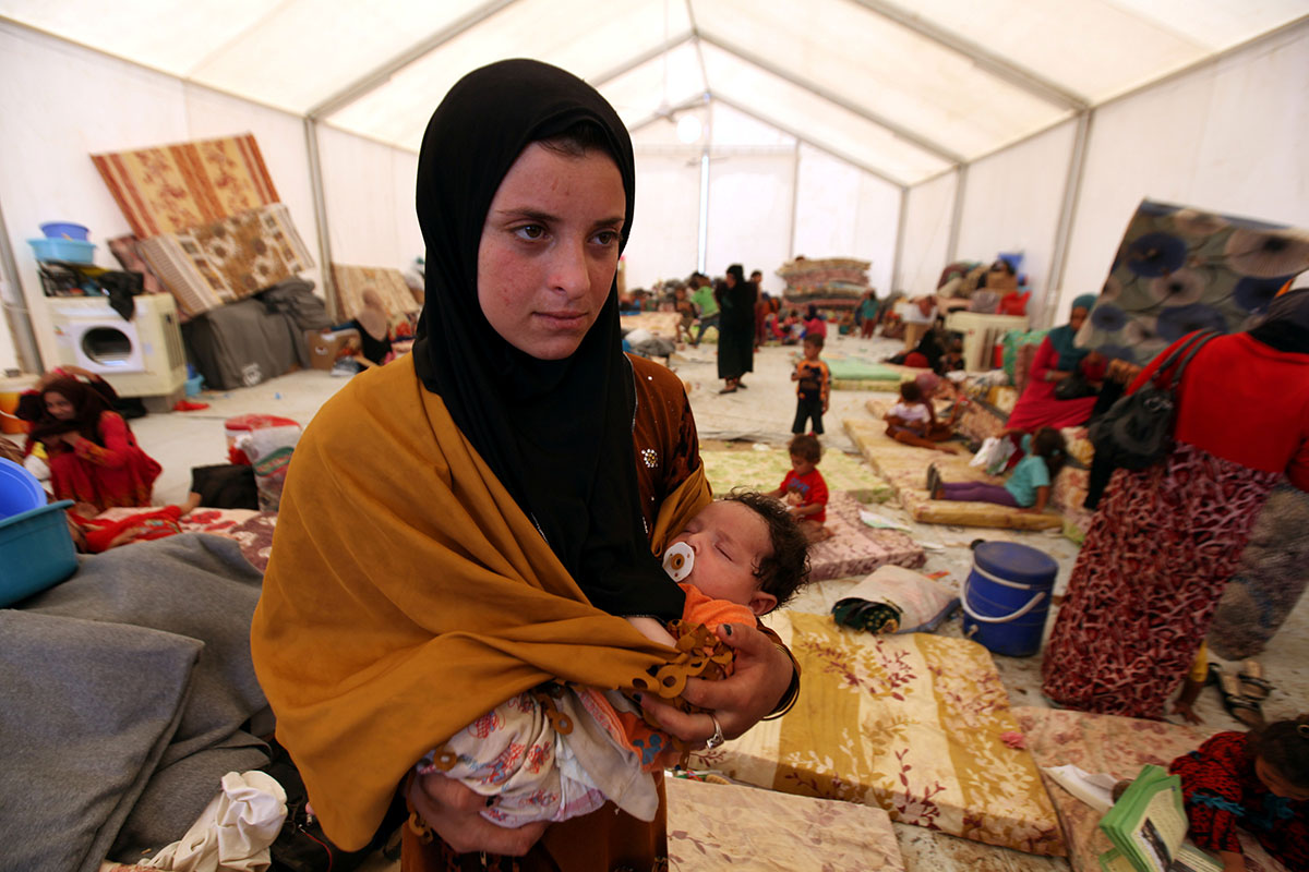 Μία εκτοπισμένη γυναίκα κρατά στην αγκαλιά της το μωρό της στο προσφυγικό στρατόπεδο στην περιοχή Makhmour κοντά στη Μοσούλη στο Ιράκ, 15 Ιουνίου 2016, Azad Lashkari / Reuters
